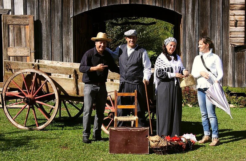 De volta à estrada, paramos na casa da Família Strapazzon, logo na frente conhecemos o casal Zeca e Nelza, os dois super simpáticos fazem fotos antigas dos visitantes com um cenário único. Não resistimos e fizemos um ensaio naquele ambiente típico das fazendas da Itália, com um parreiral ao fundo, carroças, um casa de madeira e é claro com todas as vestimentas da época e os utensílios utilizados na colheita da uva.